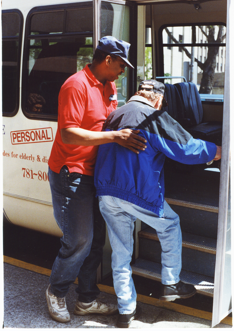 - Ninus Hopkins helps an elderly passenger board the ACCESS van.