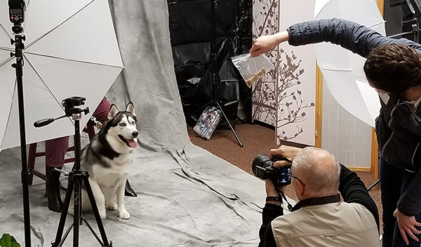 A volunteer uses a bag of food to lure this husky to look in the right direction.