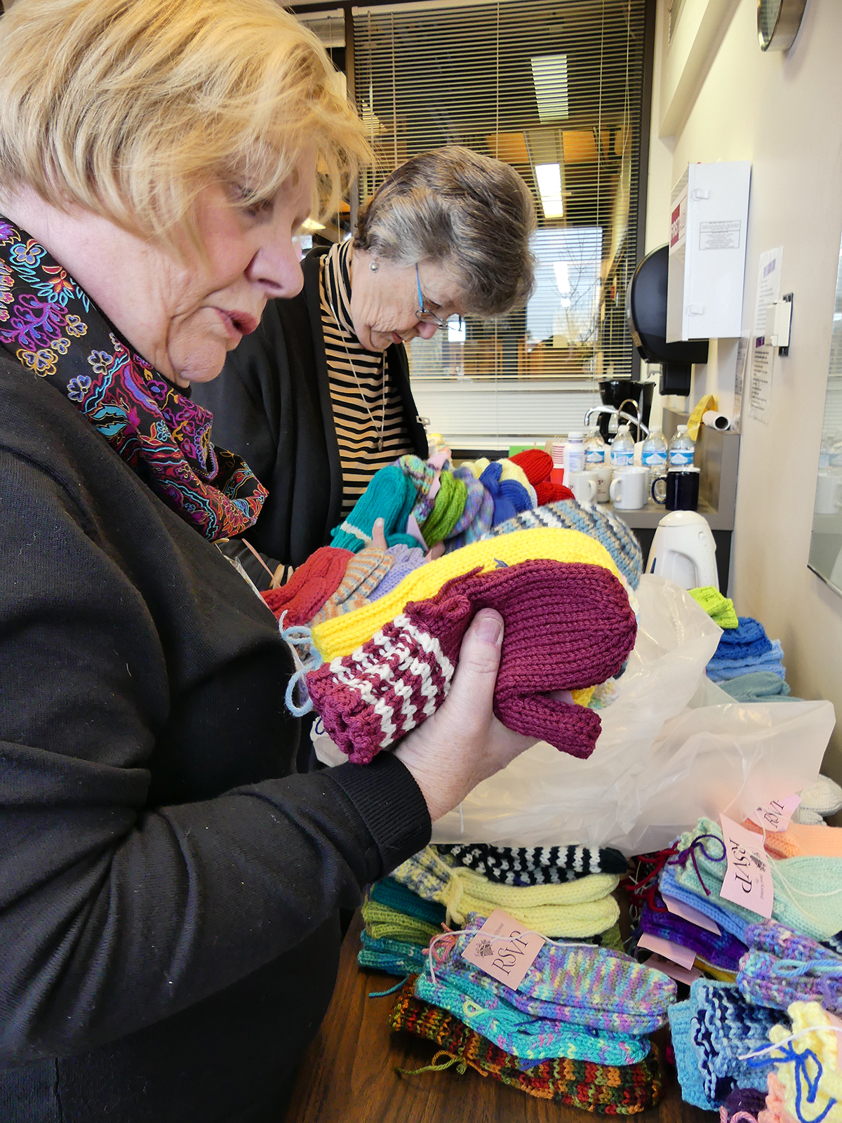For over two decades, Knit-It-Alls (KIA) volunteers from Solid Ground’s Retired and Senior Volunteer Program (RSVP) have quietly created mountains of warm items. RSVP gathers them together at the start of the holiday season to package and distribute to nearly 25 local housing programs, food banks, and other community organizations. The agencies in turn get them to people in need across King County.